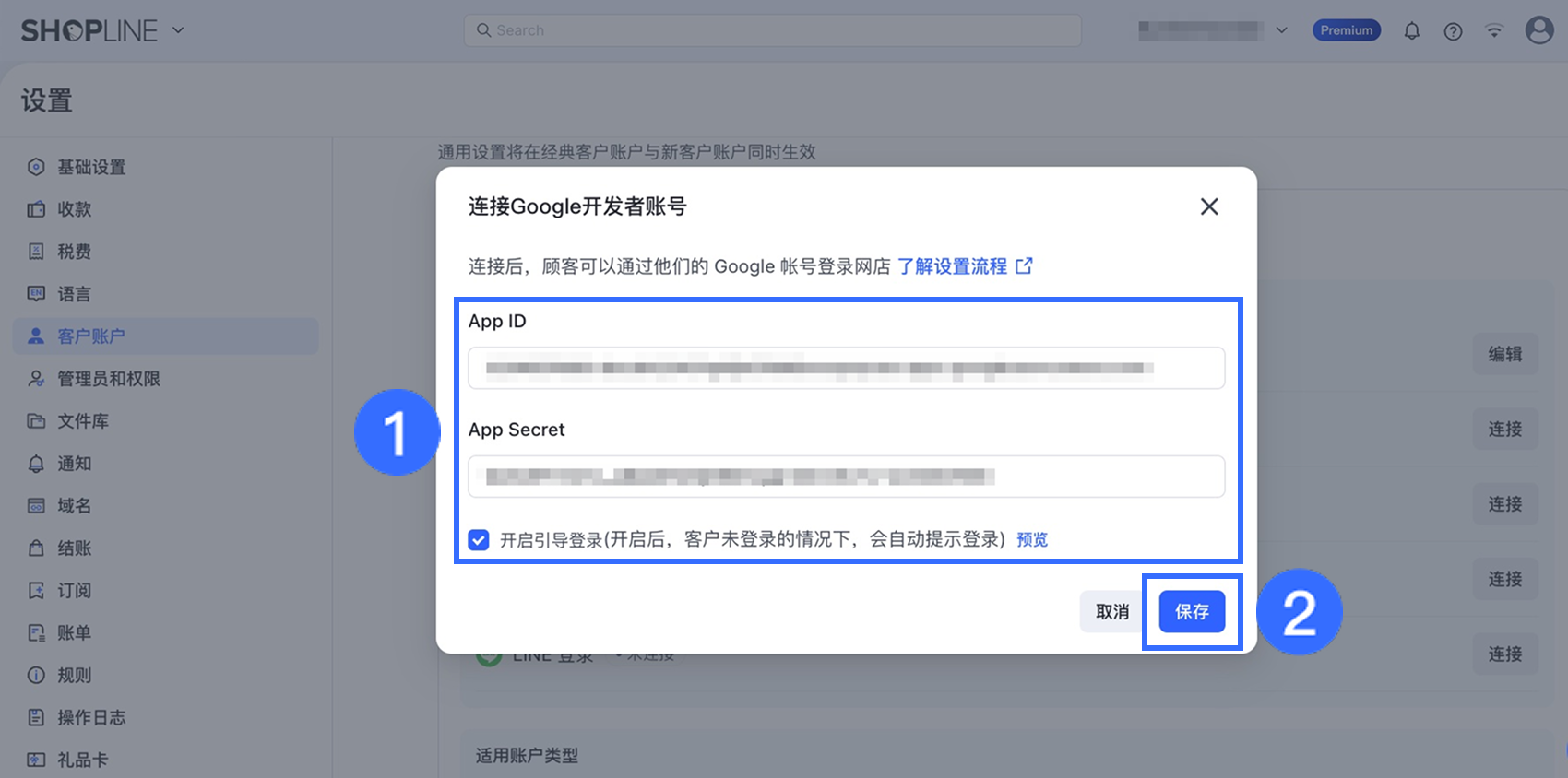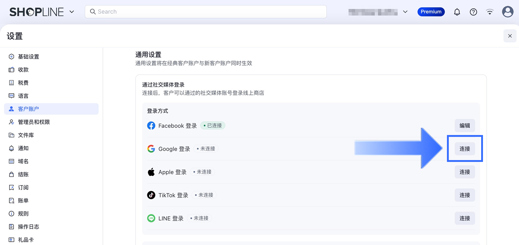 完成以上操作后,您的客户端 ID 和客户端密钥就已经设置完成啦!接下来需要将在 Google 处获得的客户端 ID 和客户端密钥对应填写至 SHOPLINE 后台。在 SHOPLINE admin 中,点击【设置】>【客户账户】>【通用设置】>【通过社交媒体登录】,找到【Google 登录】选项并点击【连接】。