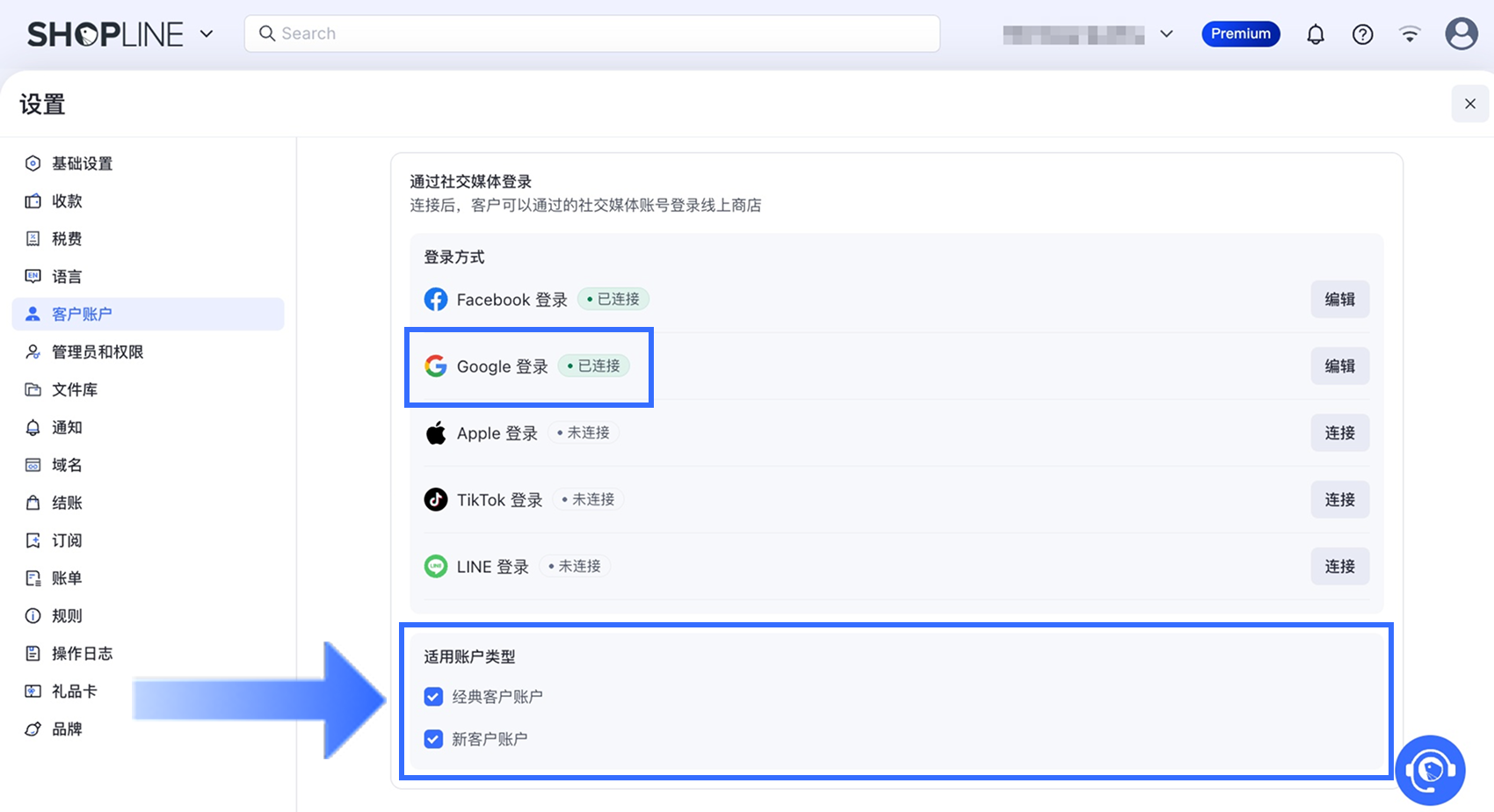 完成后,Google 登录选项将显示为【已连接】状态。根据您的业务需求,在【适用账户类型】区块中选择是否为【经典客户账户】、【新客户账户】,或同时为两者启用第三方登录功能。