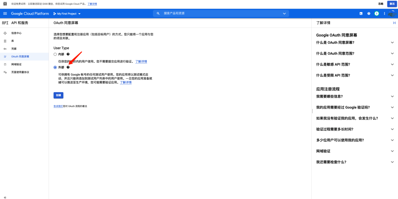 - 选择 User Type 为【外部】,点击【创建】。
