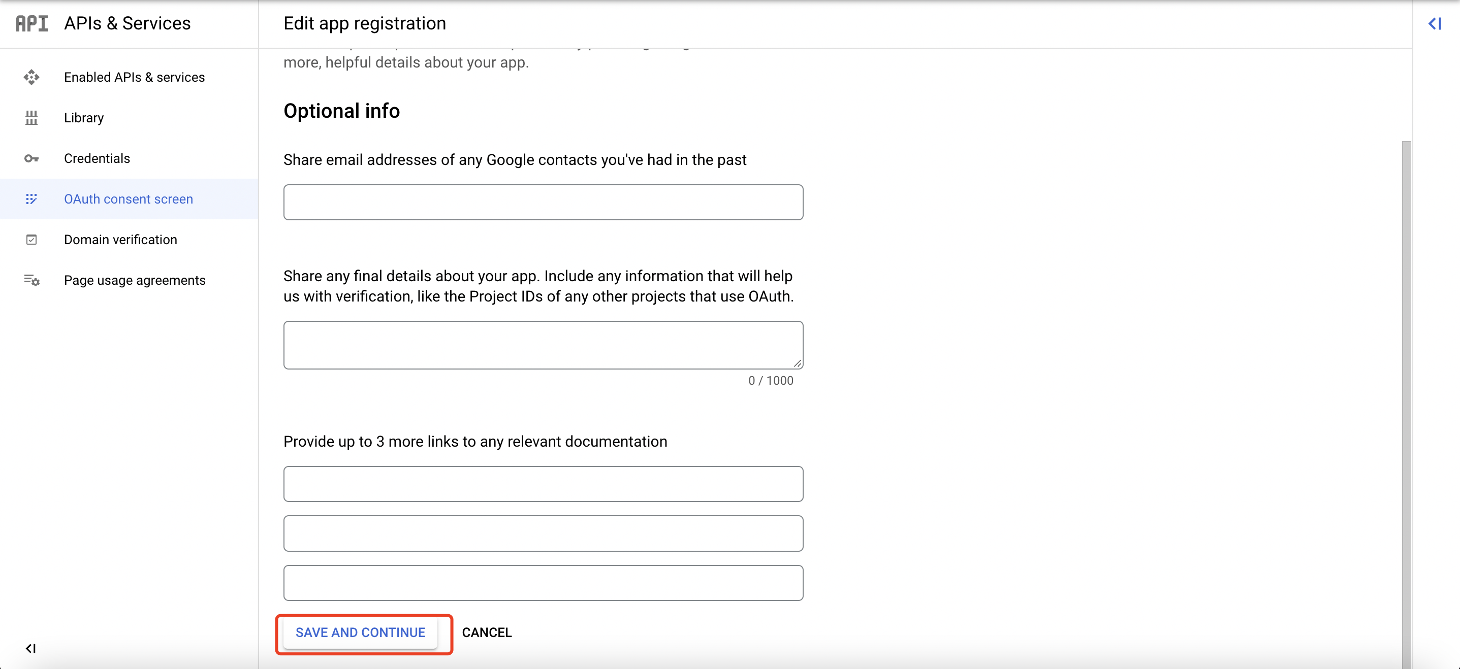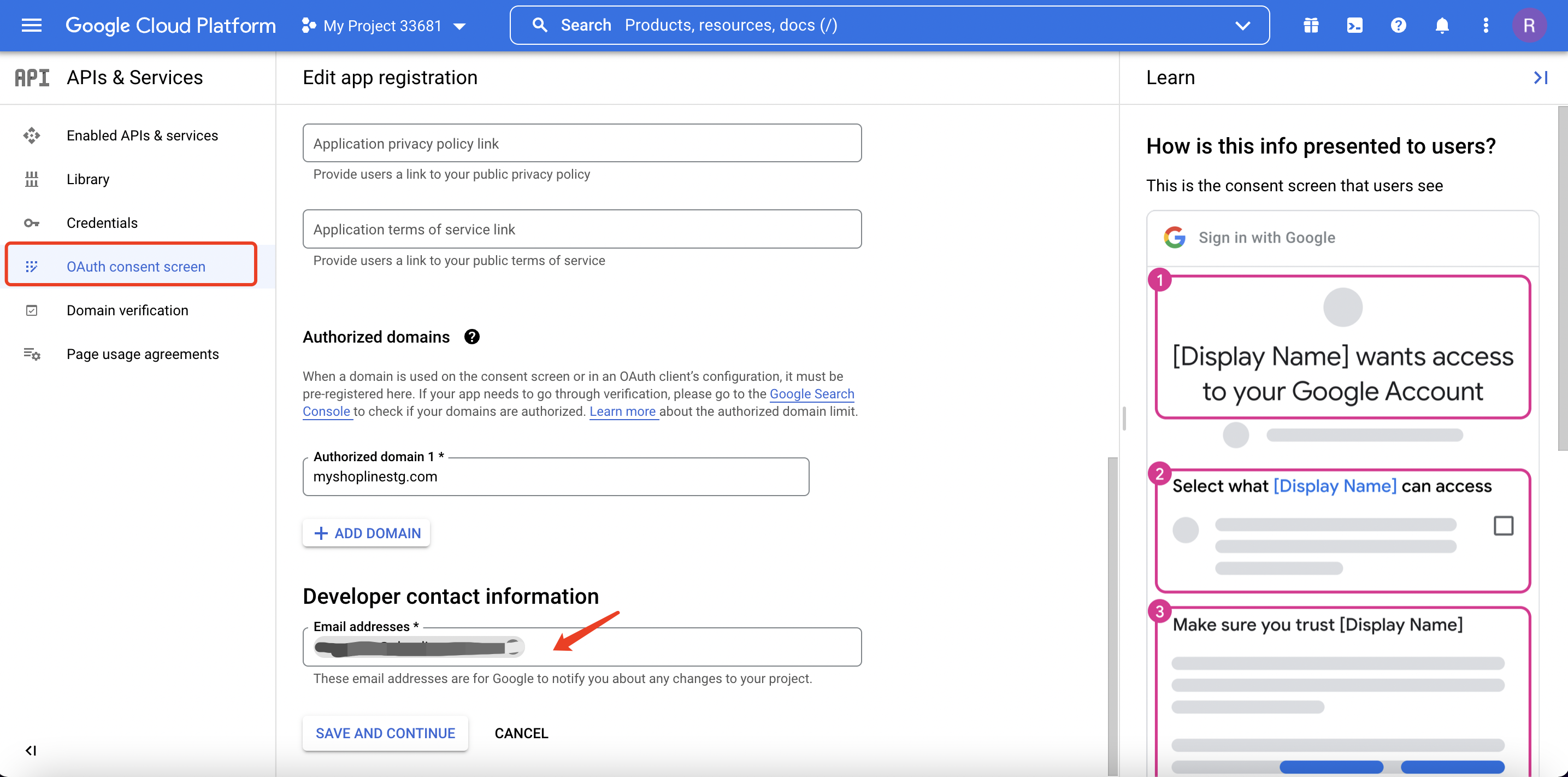 - 填写【应用名称】和【电子邮件】,并点击【保存并继续】。