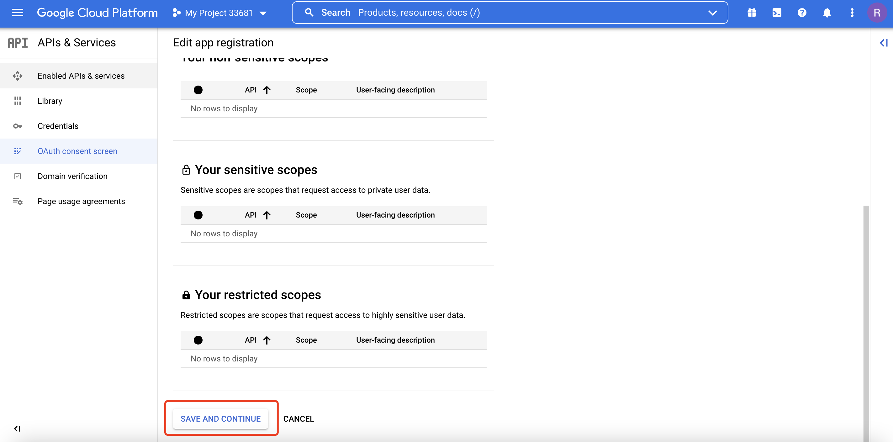 - 进入范围页面,点击【保存并继续】。