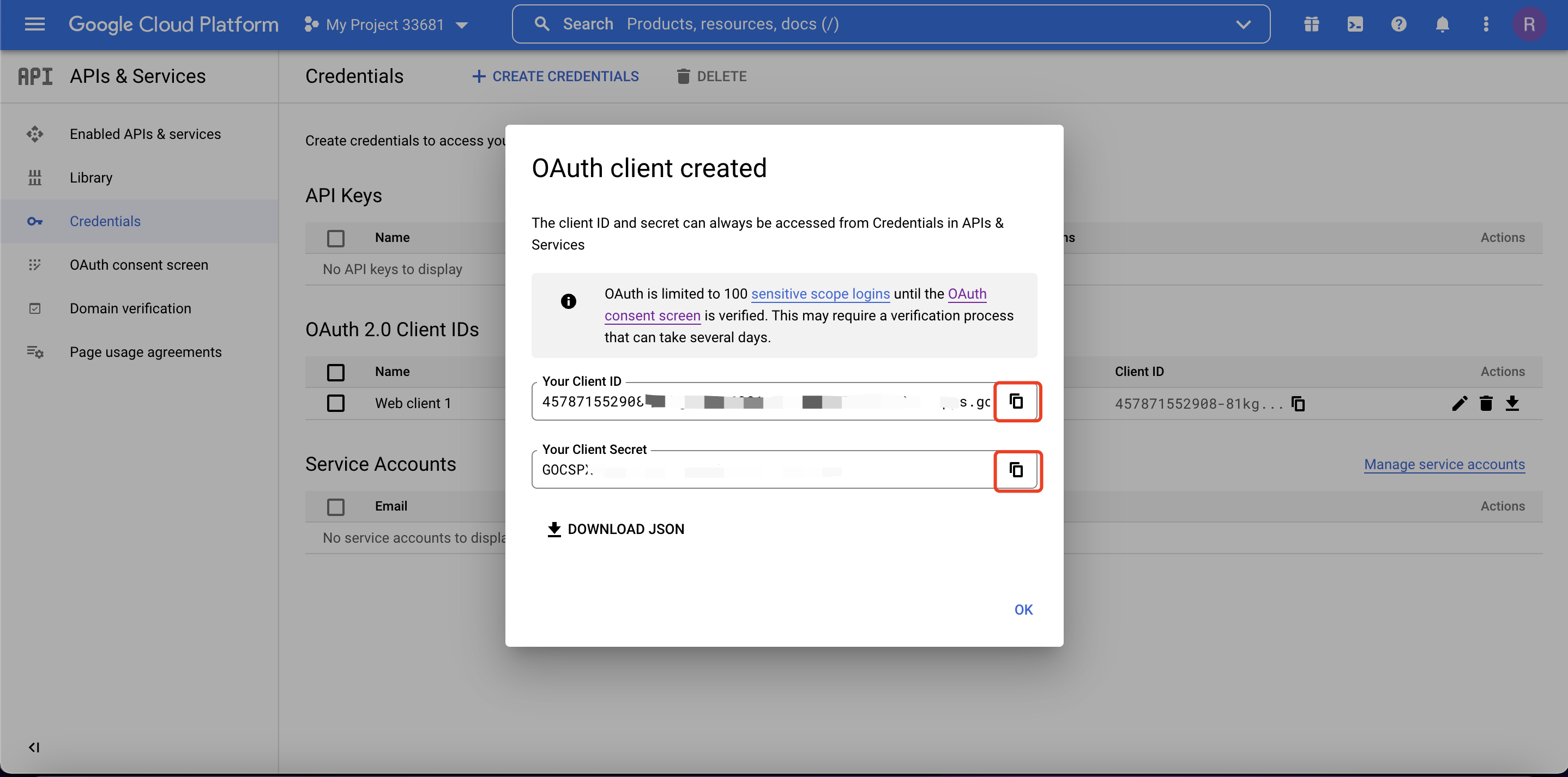 - 在 Google 云平台获取客户端 ID 和客户端密钥。