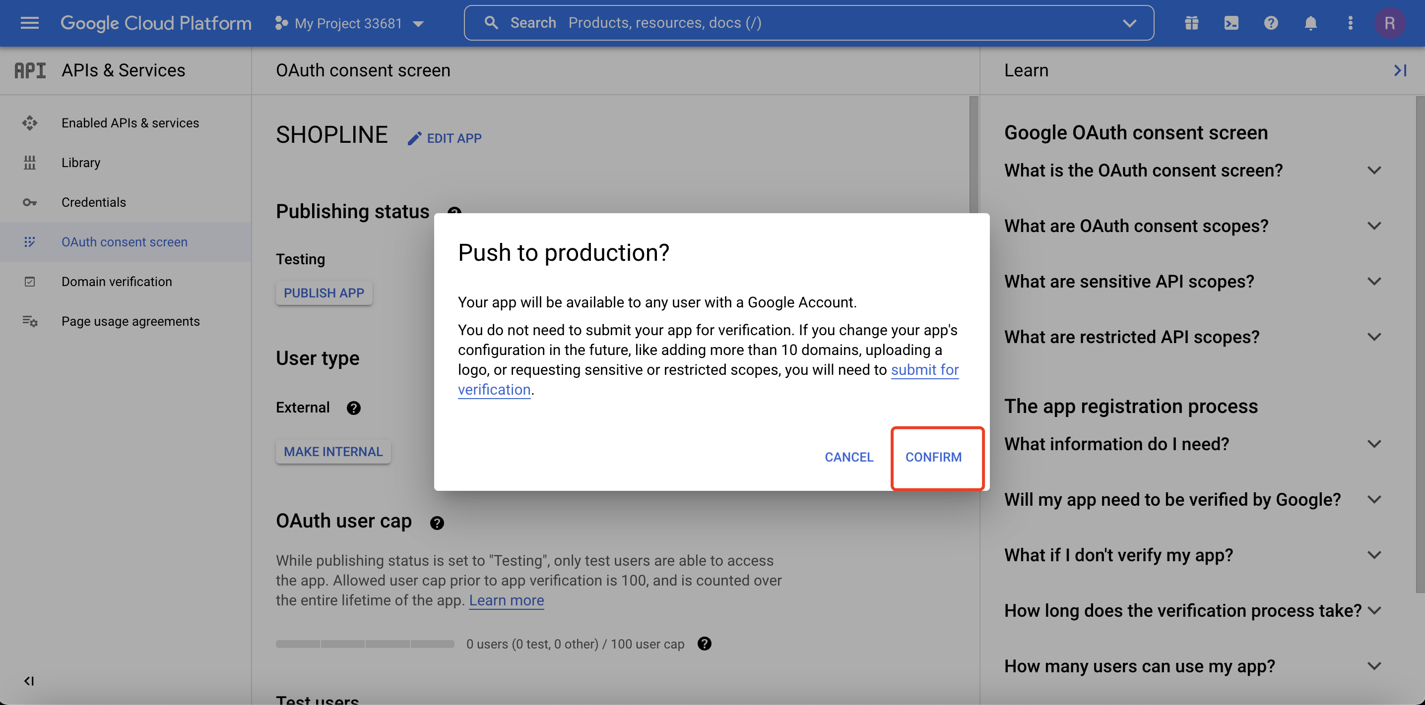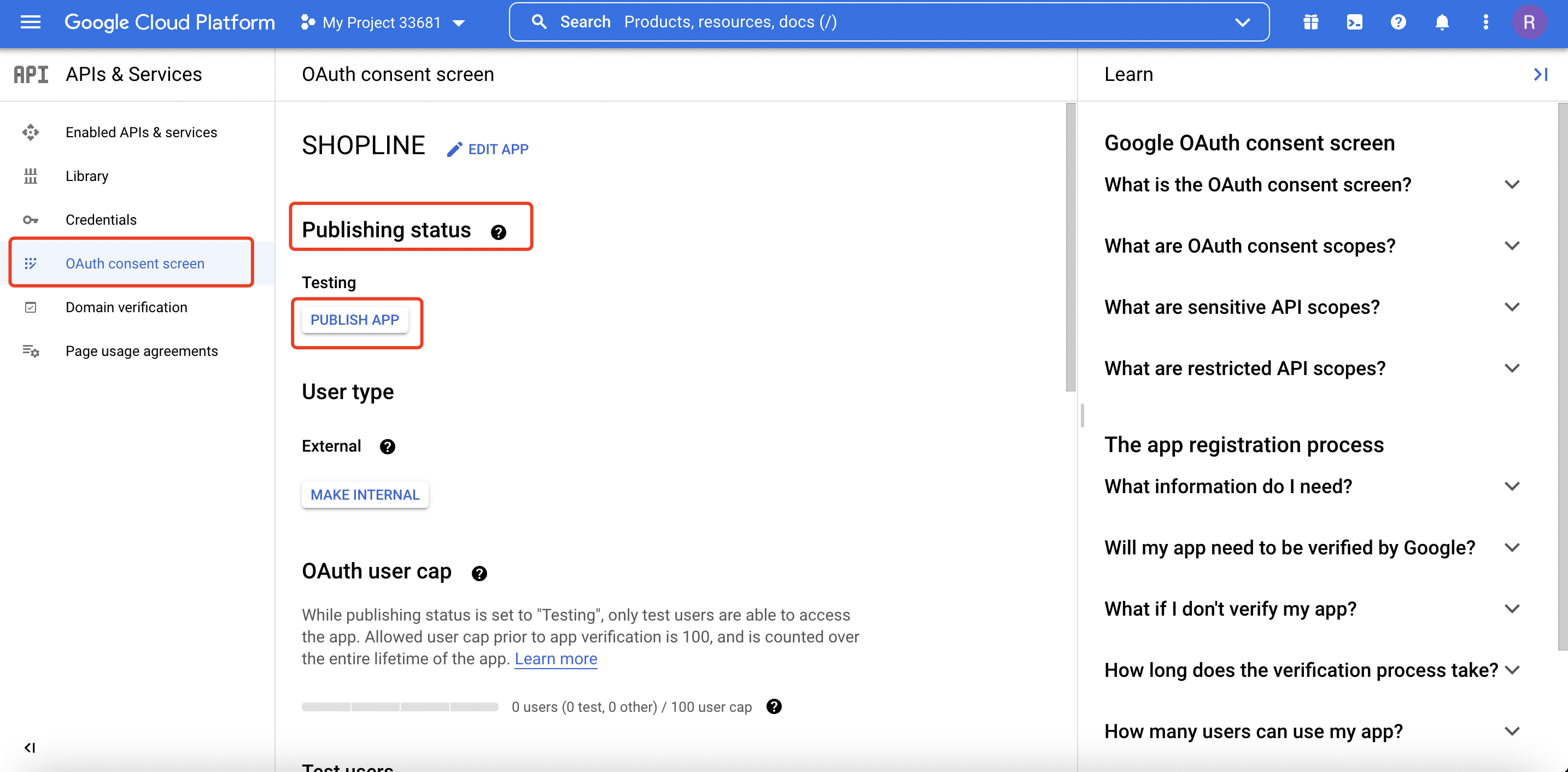 此处的【客户端ID】以及【客户端密钥】,对应 SHOPLINE 后台弹窗内的【App ID】和【App Secret】。 - 点击【OAuth 同意屏幕 (OAuth consent screen)】,将发布状态改为【发布】。