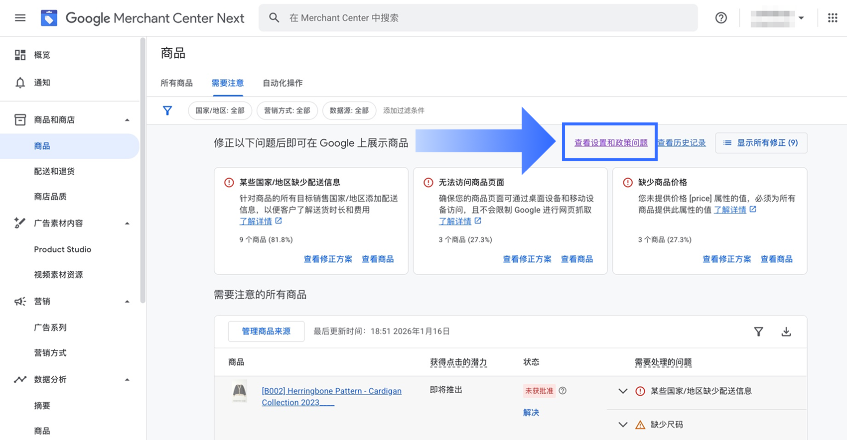 - 前往【商品】>【需要注意】>【查看设置和政策问题】。