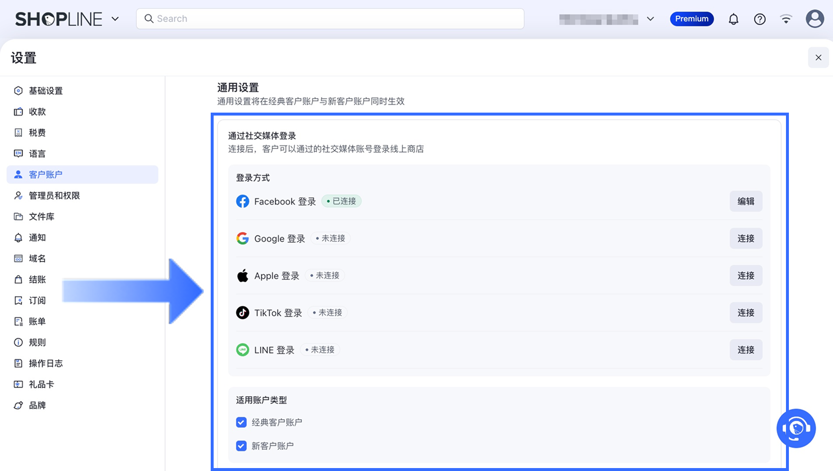 在 SHOPLINE admin 中,点击【设置】>【客户账户】。