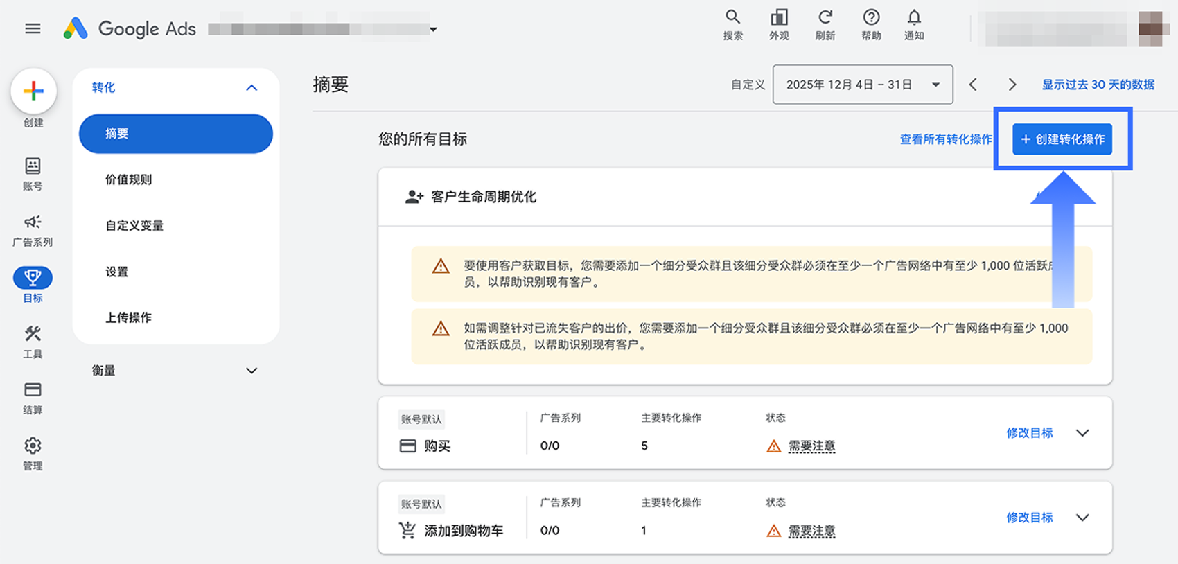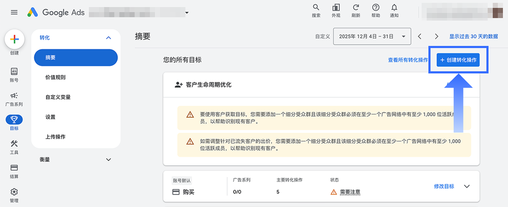 要在 Google Ads 中创建网站转化操作,请按照以下步骤操作: