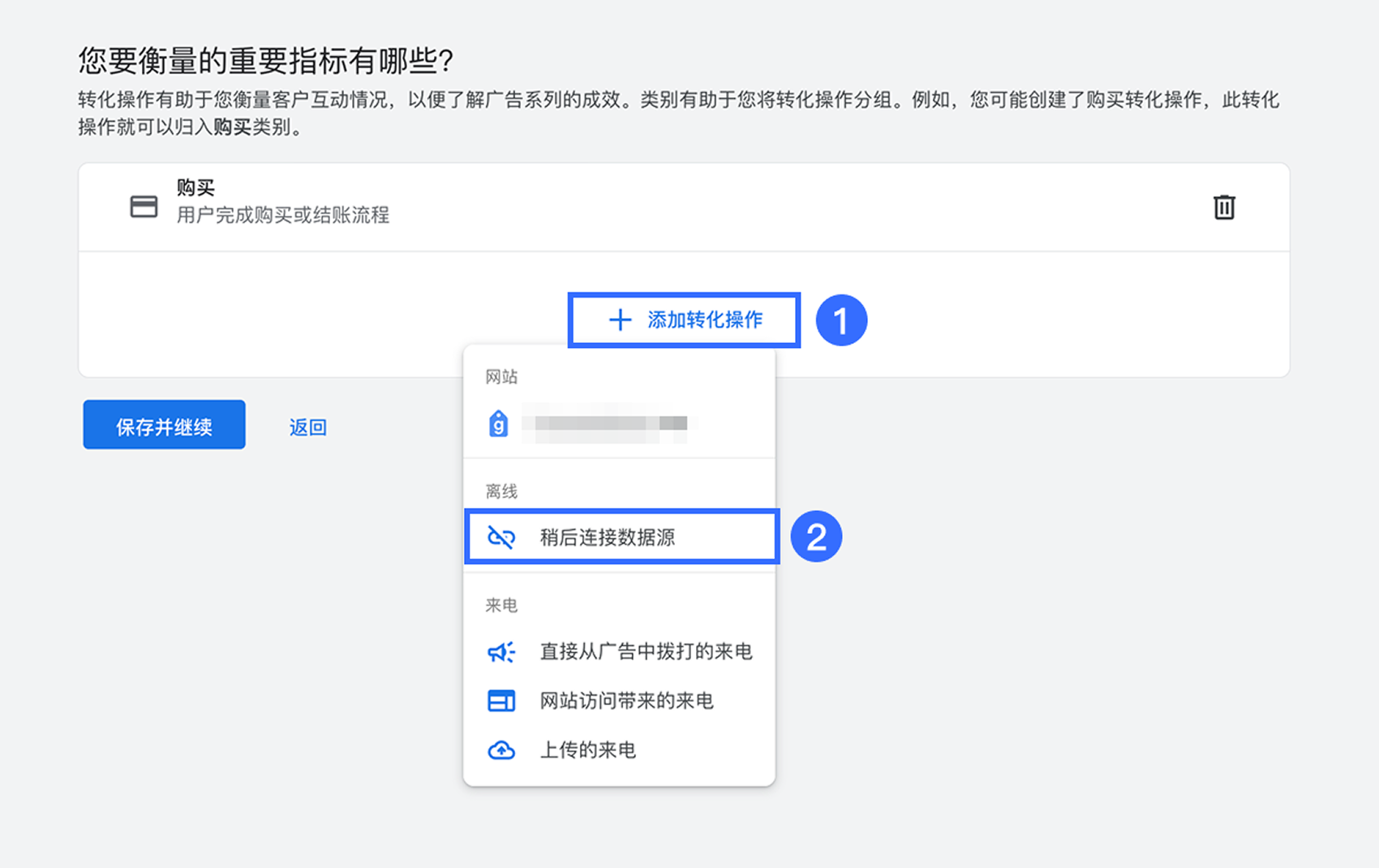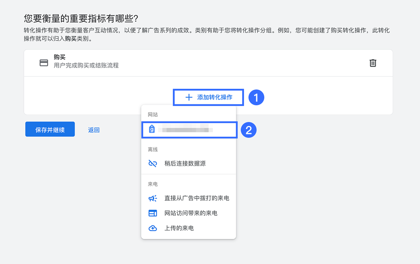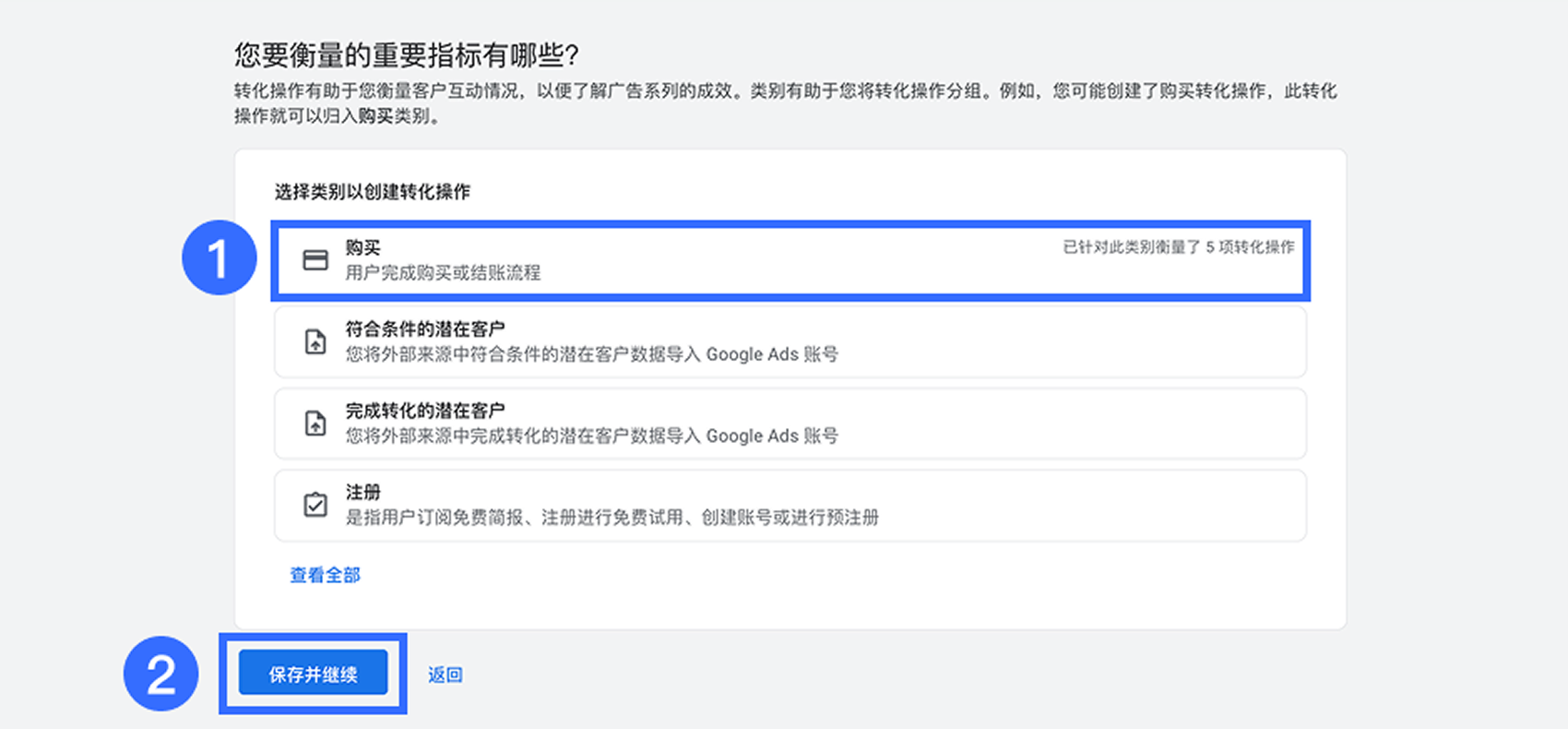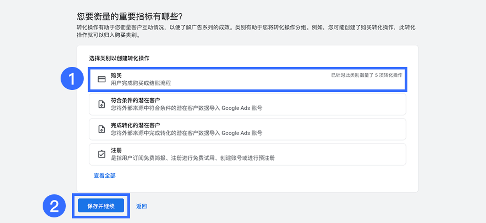 在【您要衡量的重要指标有哪些?】中选择 【购买】,然后点击【保存并继续】。