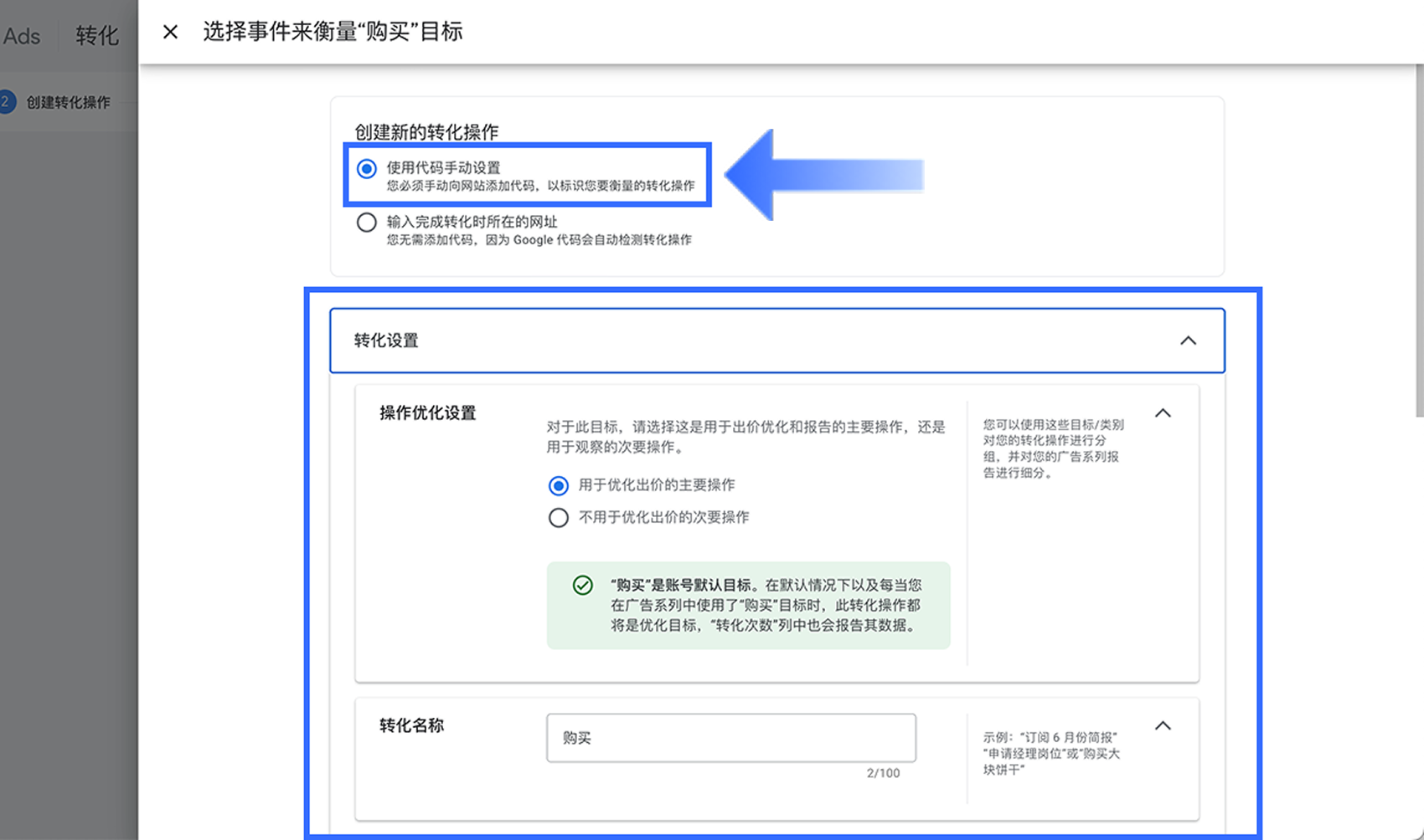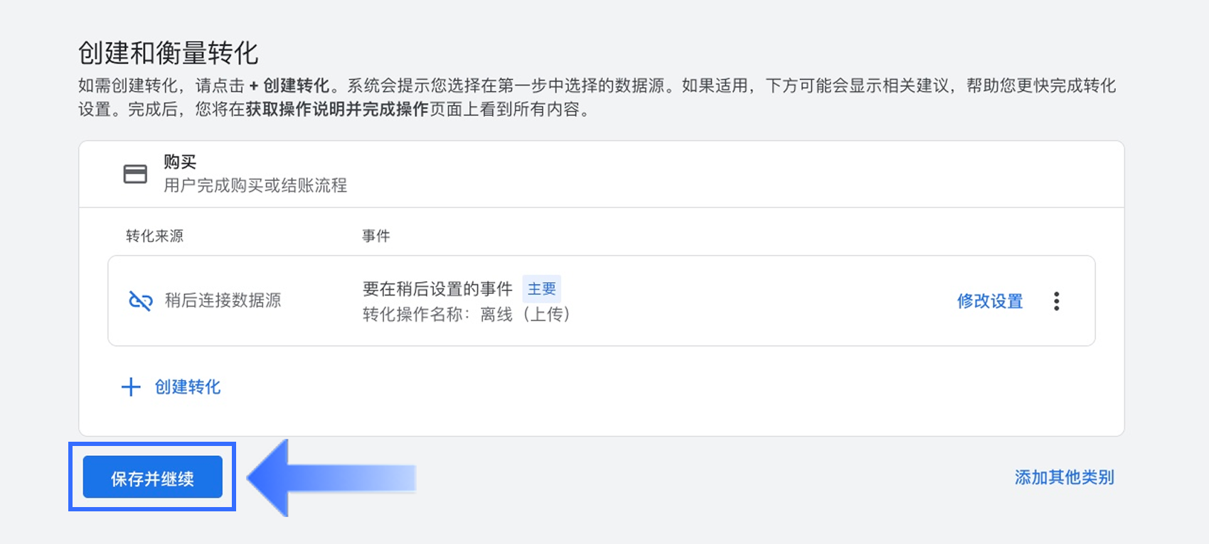 返回【购买】设置页面,确认转化操作已成功创建,然后点击【保存并继续】。