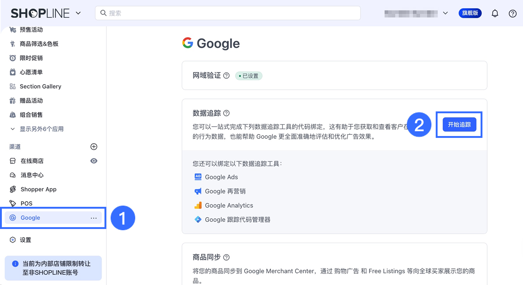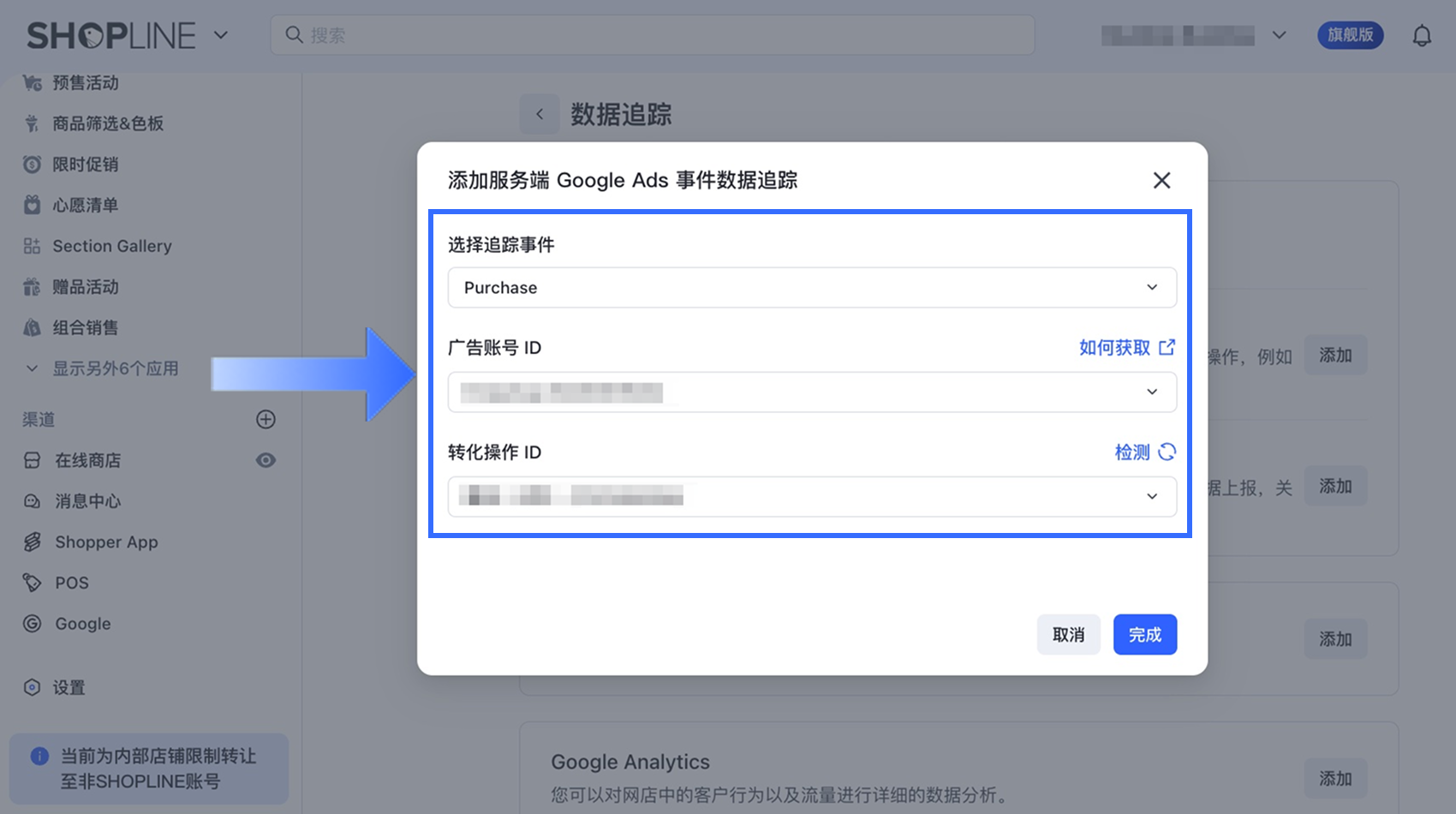 要将 Google Ads 转化跟踪连接到您的 SHOPLINE 商店,请按照以下步骤操作: