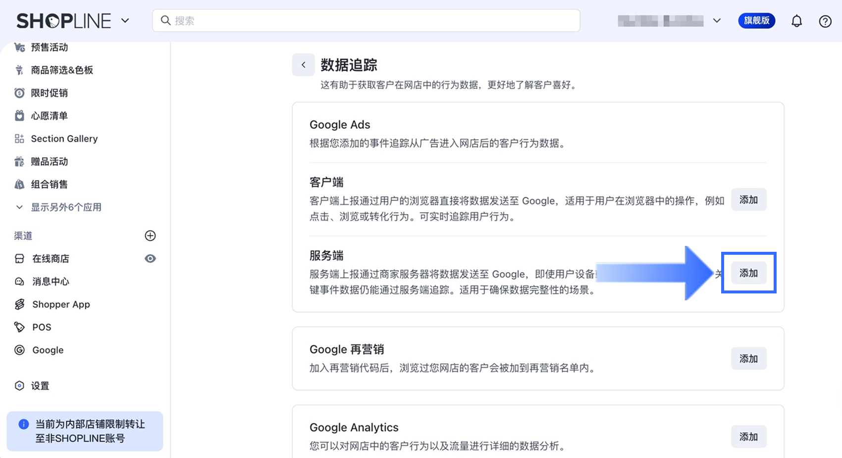 要将服务器端转化跟踪连接到您的 SHOPLINE 商店,请按照以下步骤操作: