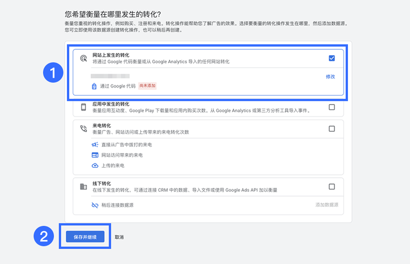 在【您希望衡量在哪里发生的转化?】中选择【网站上发生的转化】、【来电转化】、【线下转化】,然后点击【保存并继续】。