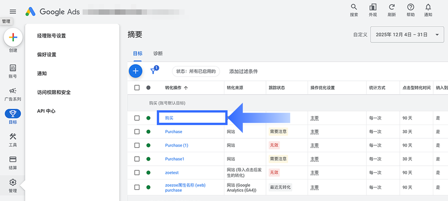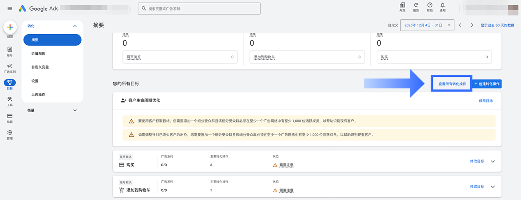 前往【摘要】页面,在【您的所有目标】区块中点击【查看所有转化操作】。