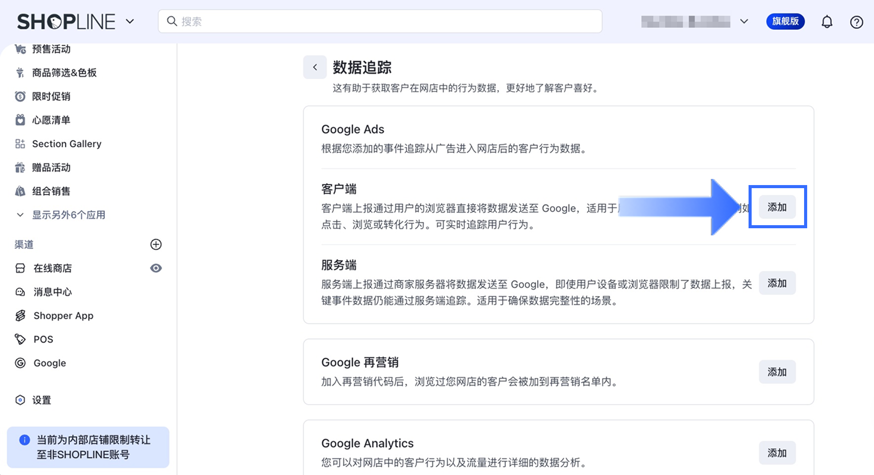 将客户端转化跟踪连接至 SHOPLINE