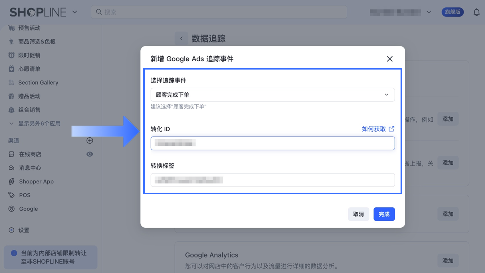 复制生成的【转化 ID】和【转化标签】,然后继续下一步,将其与 SHOPLINE 商店进行连接。