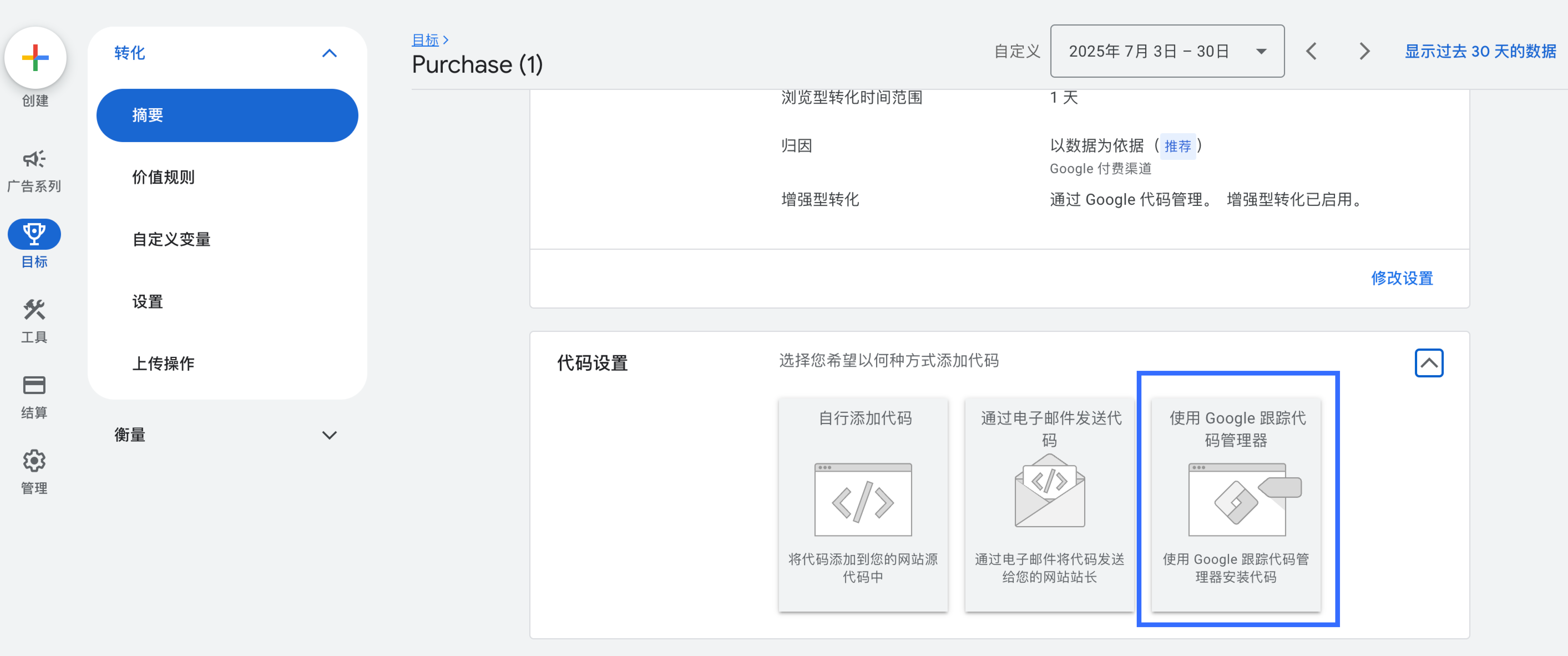 3. 下滑屏幕,在代码设置中选择【使用 Google 跟踪代码管理器】,获取【转化 ID】