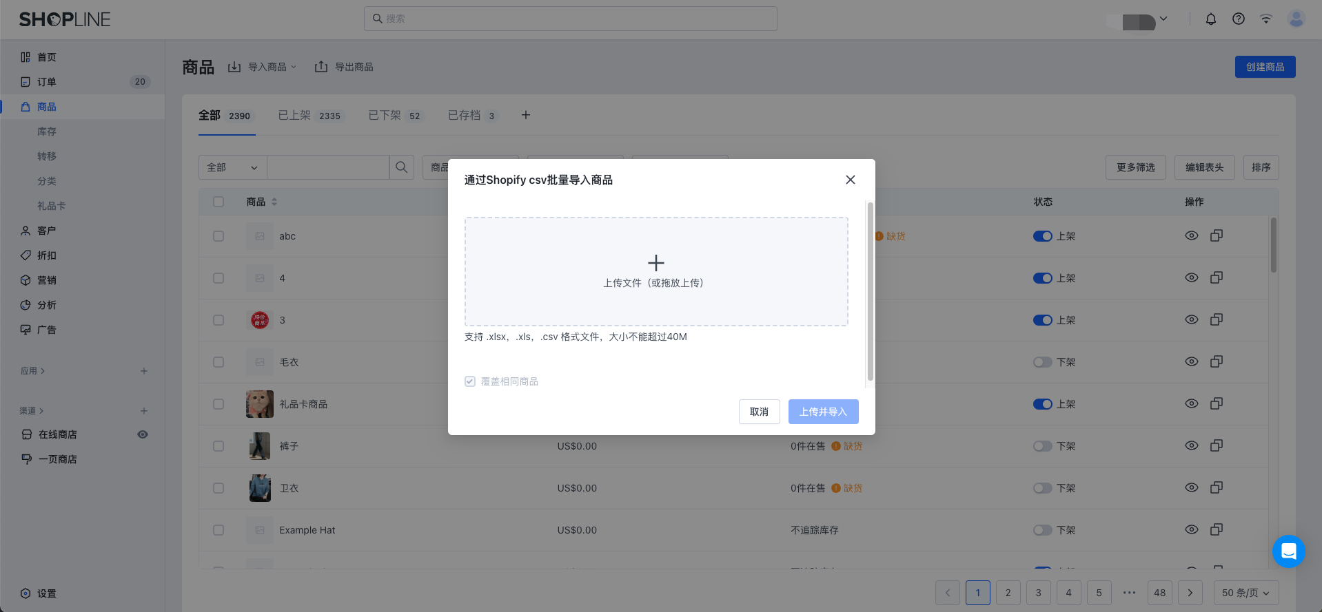在 SHOPLINE admin 中,使用 【商品】>【导入商品】>【Shopify 表格导入】功能时,选择表格,点击上传并导入后台若出现 “handle is not exist”提示,导致商品上传失败。可能是因为 Shopify 导出的表格格式为 CSV 格式,在编辑 Excel 表格之后保存格式出现乱码导致。
