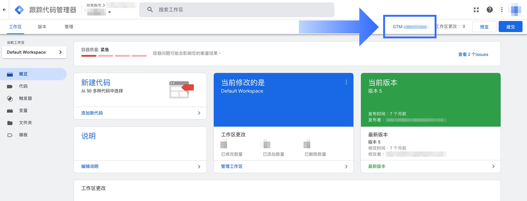 在 GTM 工作区中,于界面右上角找到并复制您的 容器 ID(格式为:GTM-XXXXXXX)。
