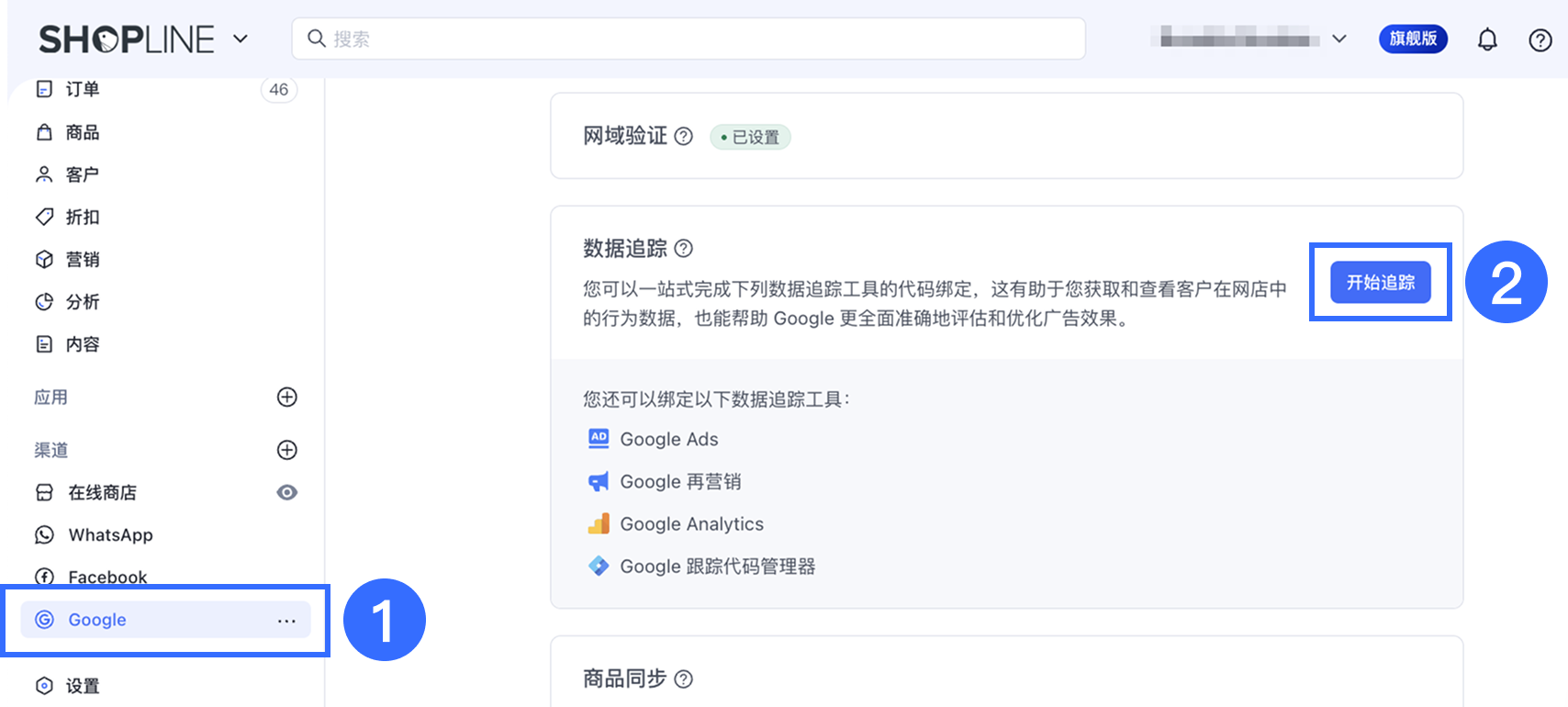 进入 SHOPLINE 管理后台,前往【渠道】> 【Google】>【数据追踪】,并点击【开始追踪】(若已设置数据追踪,则点击 【管理】)。