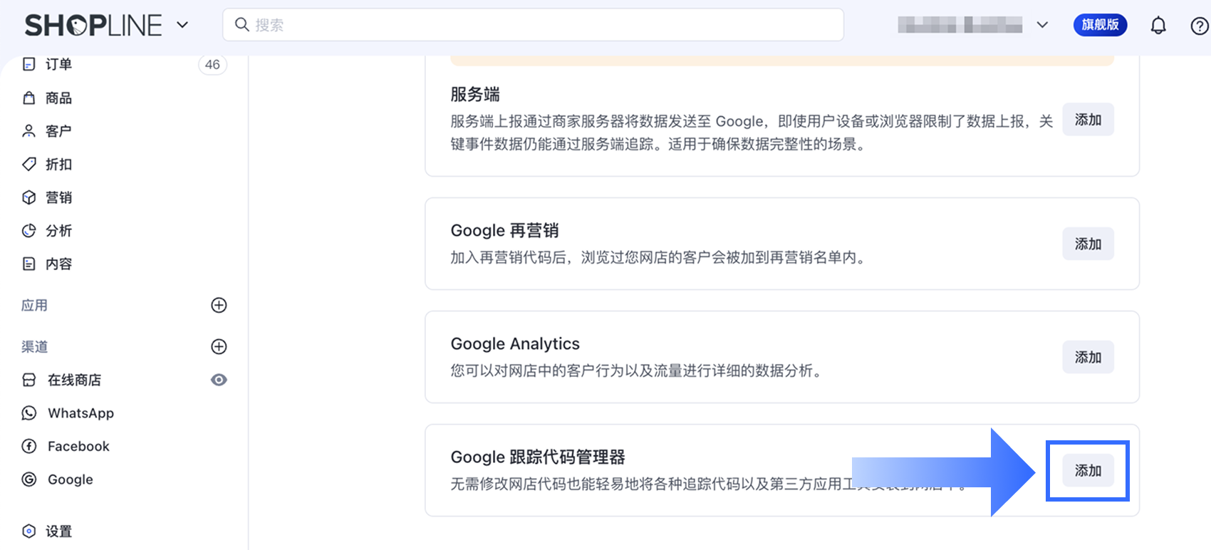 向下滚动至【Google 跟踪代码管理器】区块,并点击【添加】。