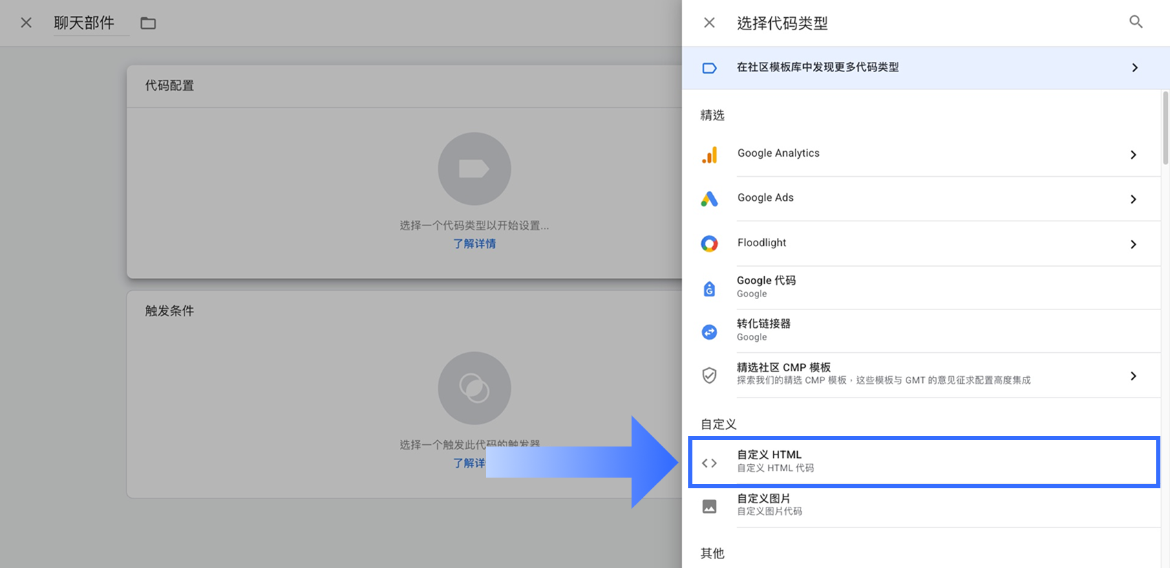 若您希望安装弹窗服务、聊天工具或其他分析脚本等第三方工具,可通过 GTM 的 自定义 HTML 标签 或现有标签模板来实现: