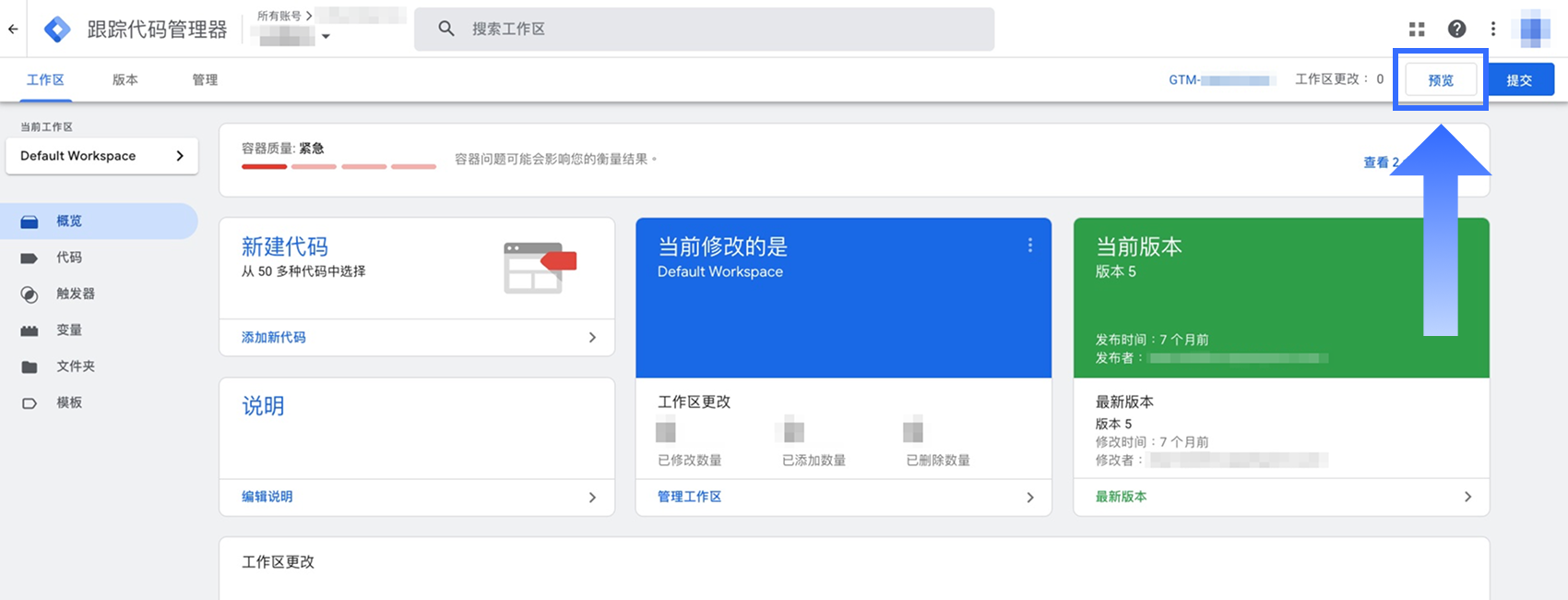 在 Google Tag Manager 中,点击右上角的【预览】。