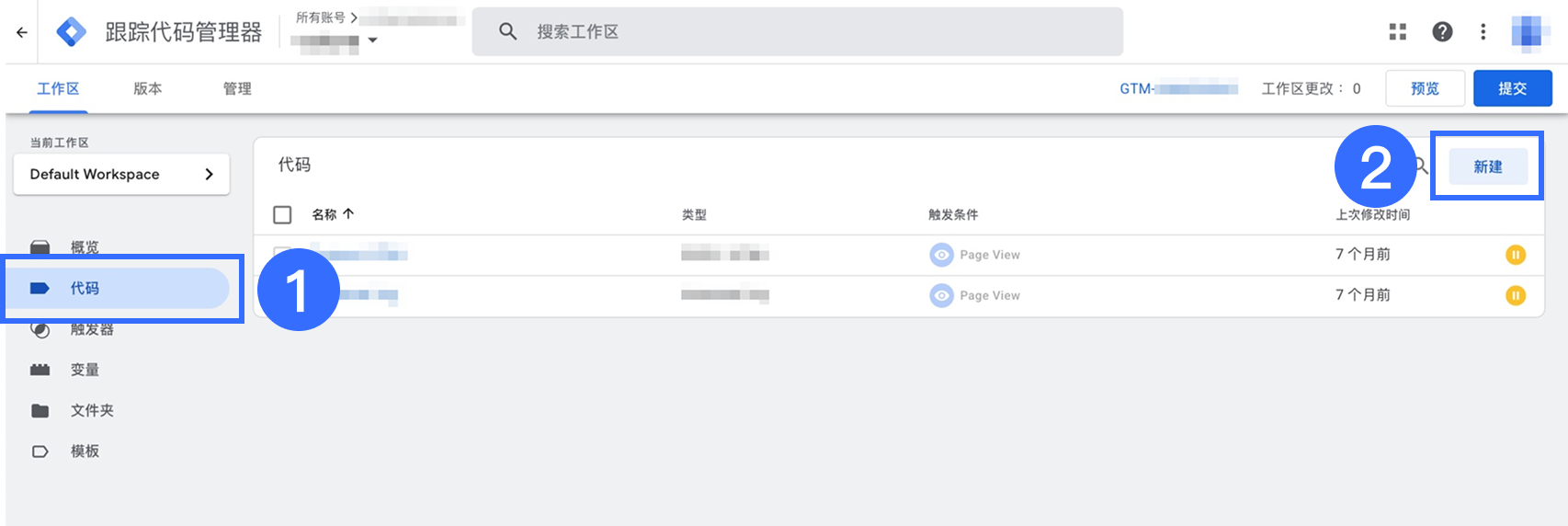 在 Google Tag Manager 中,点击【代码】>【新建】。